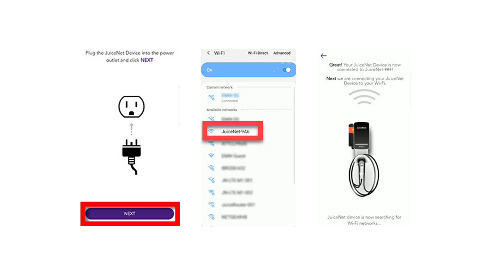 7. Navigieren Sie zu den WLAN-Einstellungen auf Ihrem mobilen Gerät. Stellen Sie eine Verbindung mit dem WLAN-Netzwerk „Waybox-###“ oder „JuiceNet-###“ her. Wenn das Netzwerk ein Kennwort erfordert, verwenden Sie das Kennwort „GoElectric“ (Groß-/Kleinschreibung beachten).