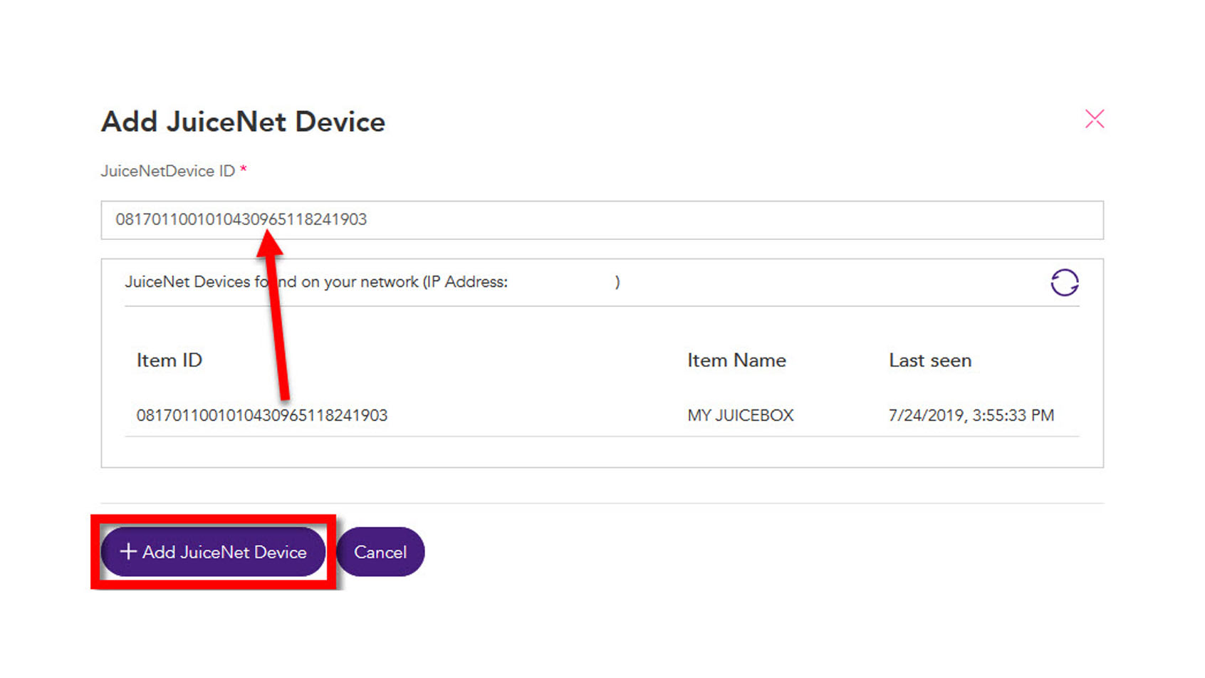 Tip: JuiceNet detects and displays all devices on the local network. Click on the appropriate Device ID to automatically paste it into the entry field.